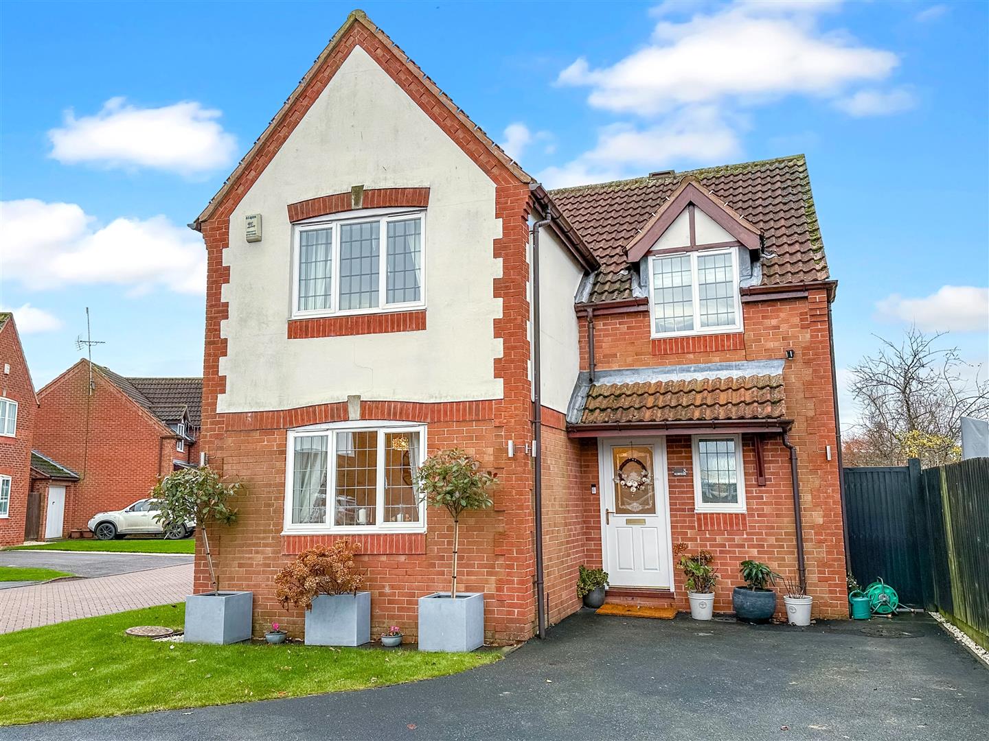 This attractive modern home occupies a delightful position, in a quiet residential cul-de-sac. Situated in a well-served village location. The house stands on a wonderful 0.10 of an acre plot. The front aspect is greeted with an EXTENSIVE TARMAC DRIVEWAY. Promoting ample of-street parking for a wide array of vehicles. Sweeping down to a DETACHED DOUBLE GARAGE. The front garden is laid to lawn and of minimal maintenance, with open front boundaries and fenced rear boundaries. Access to the entrance door, with sloped tiled roof storm canopy above and three external up/ down lights.