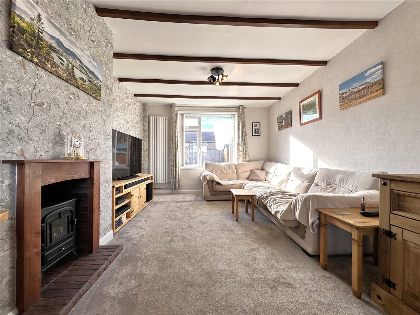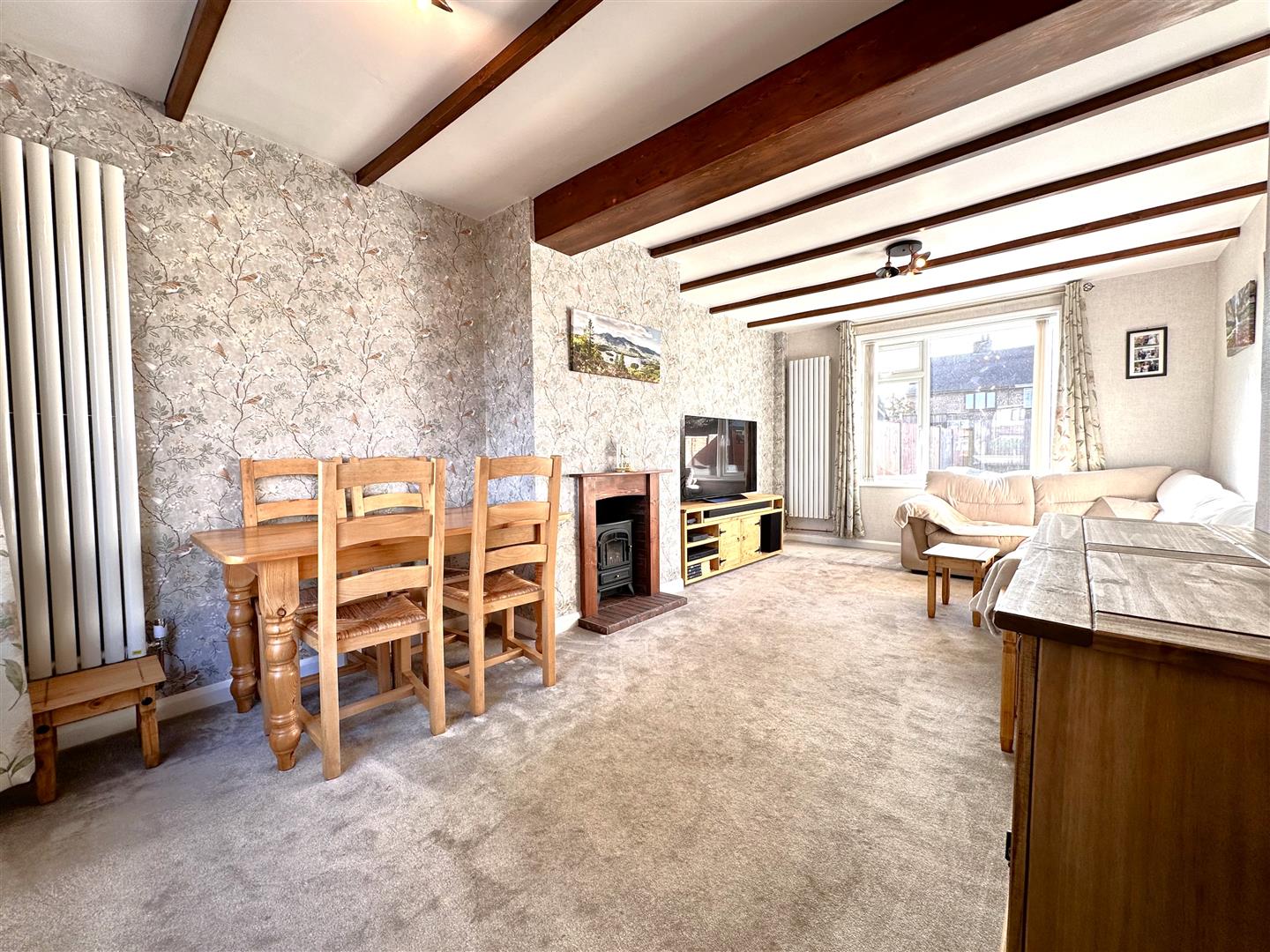 The copious internal layout comprises: Inviting entrance hall, with walk-in storage cupboard, a GENEROUS DUAL-ASPECT LIVING ROOM with feature fireplace and complementary decorative beamed ceiling. The eye-catching MODERN FITTED DINING KITCHEN is the hub of the home, with ample storage and integrated appliances.