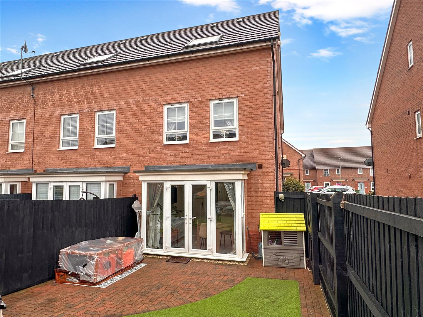 Externally, the family-friendly garden is of minimal maintenance. Enjoying an artificial lawn and block paved seating area.