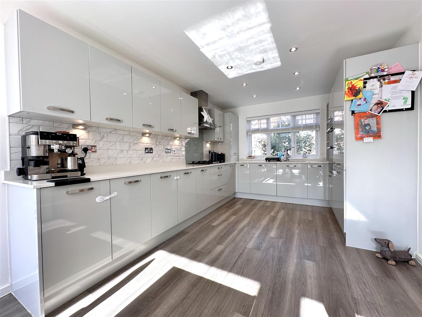 The copious internal layout comprises: Inviting entrance hall, a GENEROUS BAY-FRONTED LIVING ROOM enhanced by a SUPERB MEDIA WALL with built in electric fire and useful storage. A tasteful ground floor W.C and a MAGNIFICENT OPEN-PLAN LIVING/ DINING FAMILY KITCHEN. Equipped with a range of integrated appliances, a feature side bay-window with reading bench, Velux roof lights and French doors out to a lovely paved seating area. Internal access into a separate utility room.