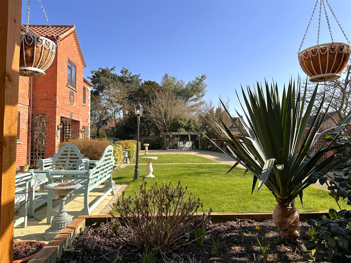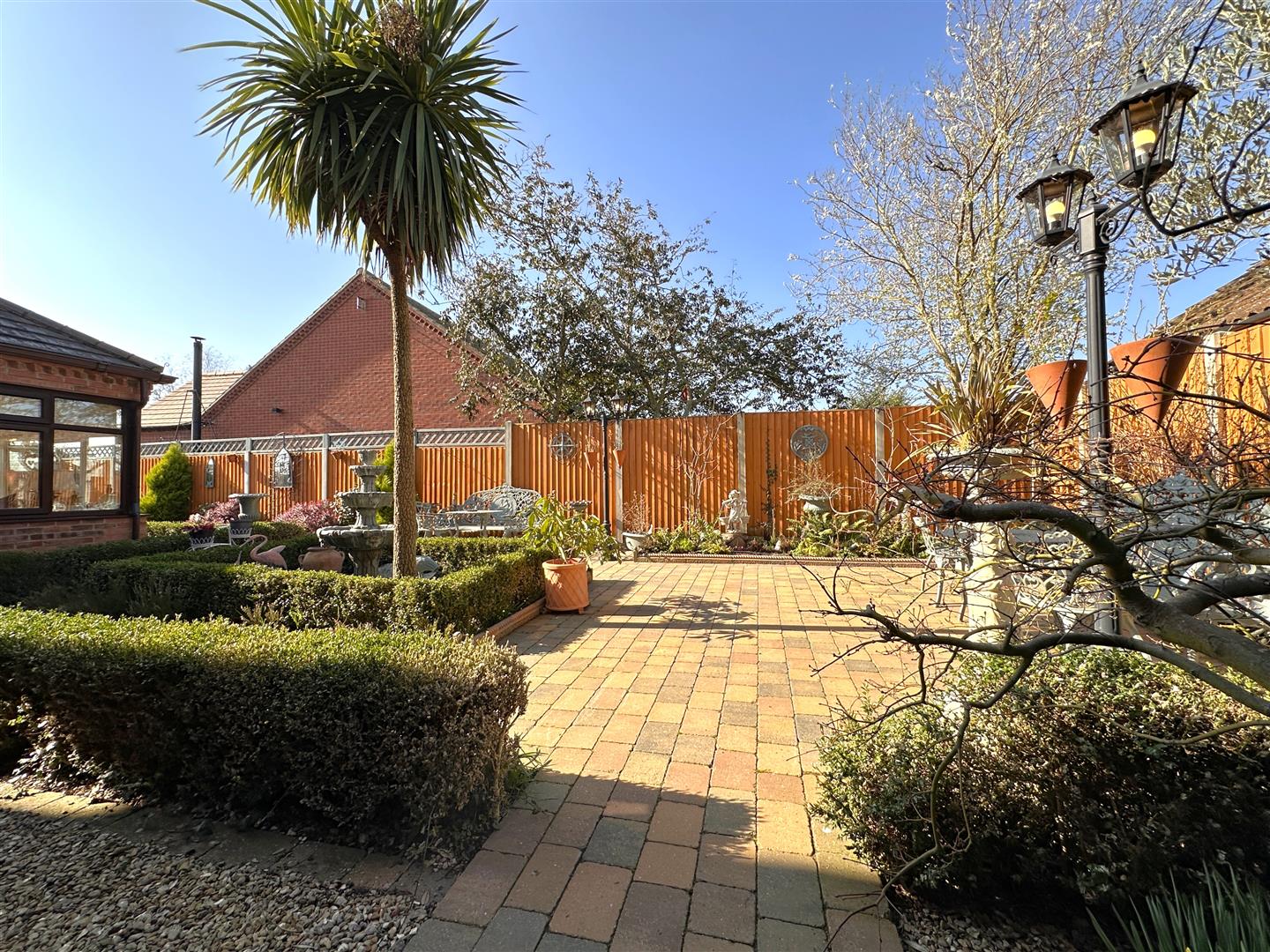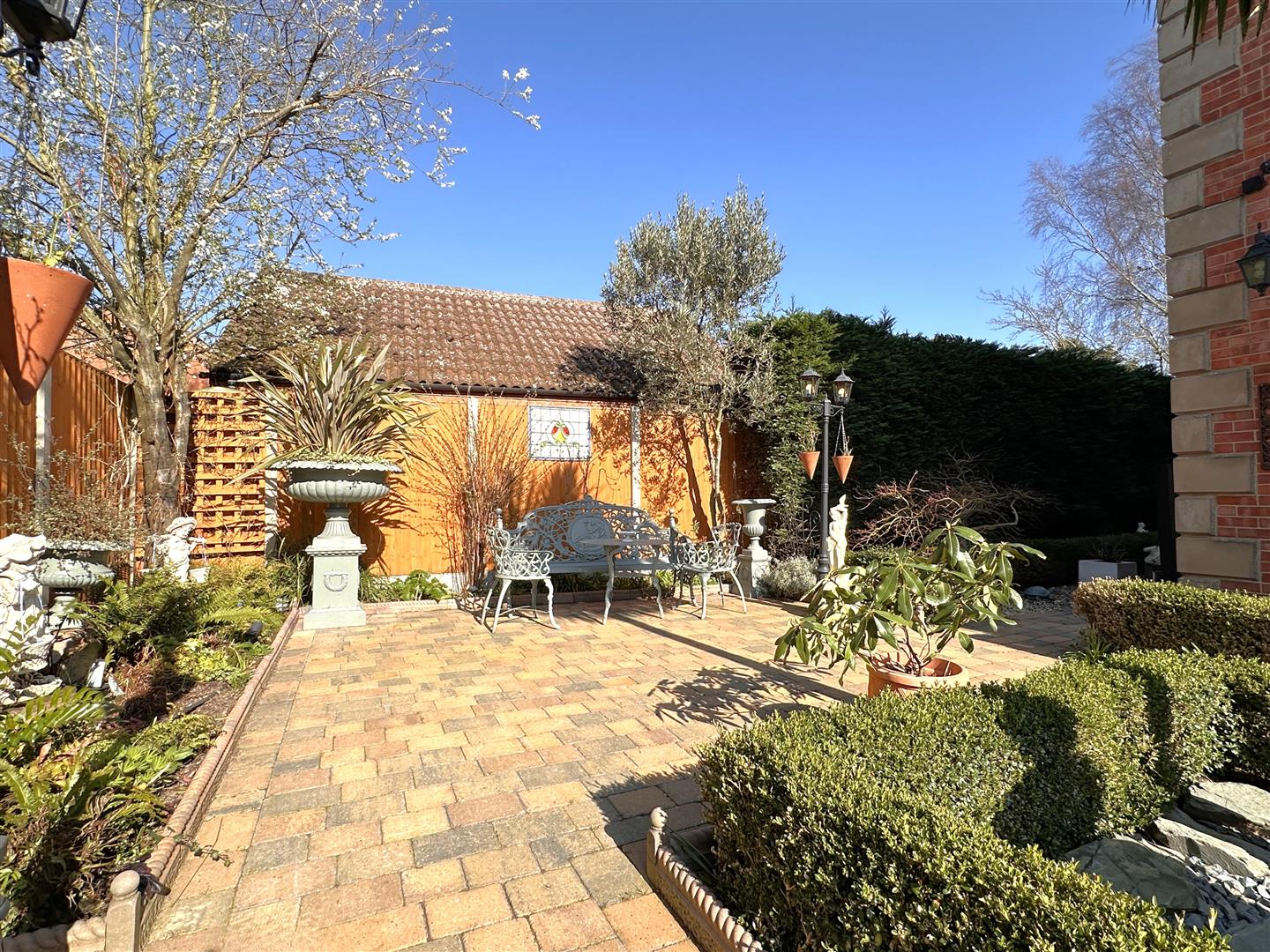The front garden is laid to lawn, with a mature planted hedge-rows and a wrap-around block paved pathway. Leading to the entrance porch and a sizeable paved outdoor entertainment area, with a pergola and two lamp-posts. The block paved pathway continues to the left side aspect. Complemented by an array of attractive planted borders. This follows down to an additional, secluded block paved seating area, with further mature hedge-rows and trees. There are three outside taps and three double external power sockets, all sensibly positioned around the plot. The high-degree of privacy is enhanced by a walled front boundary, fenced side and rear boundaries.