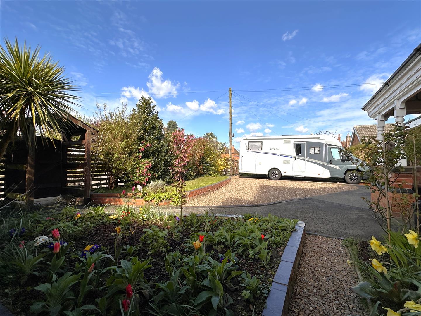 This eye-catching semi-detached home is pleasantly situated in a charming and well-connected village, close to amenities and main road links. The property stands proud on a WONDERFUL 0.16 OF AN ACRE PRIVATE PLOT. The front aspect is greeted with dropped kerb vehicular access onto an EXTENSIVE DRIVEWAY. Part concrete and part gravelled with sufficient parking for a variety of vehicles, including a caravan/ motor home, with access into the DETACHED GARAGE. A wooden front personal gate opens onto a concrete pathway, up to the porch (with fitted bench) and front door. The lovely and well-tended front garden hosts a range of delightful planted borders, two external security lights, provision for a bin store and access to the concealed gas meter. There is a fenced front/ left side boundary and a privet hedged right side boundary.