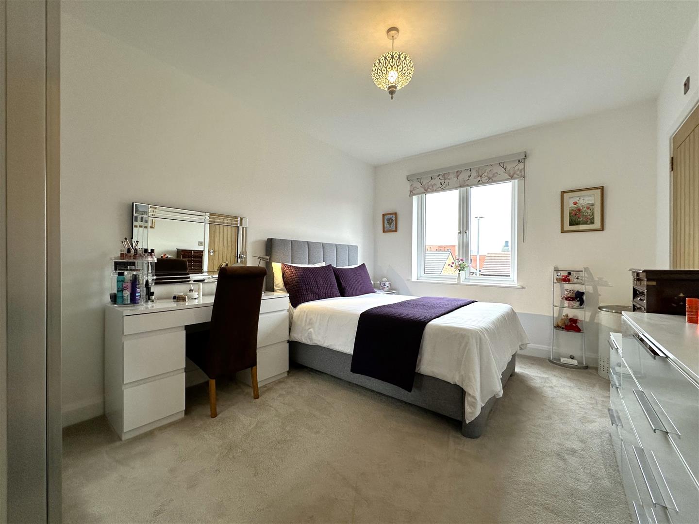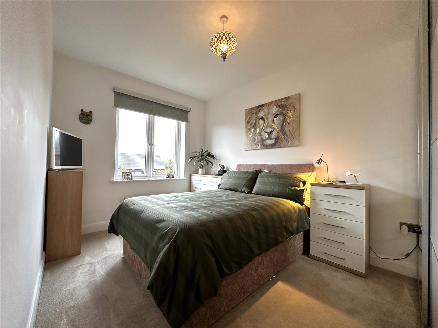 This attractive modern home lies in a quiet residential area. Convenient for access to the Town Centre, main road links and amenities. The front aspect is greeted with a paved pathway, leading to the front entrance door, with storm canopy above, external up/ down light and an attached external store. The front garden is laid to lawn, with partially planted borders and a metal fenced front boundary.