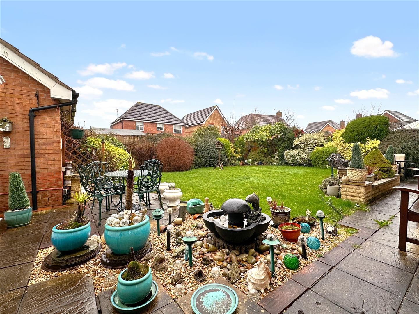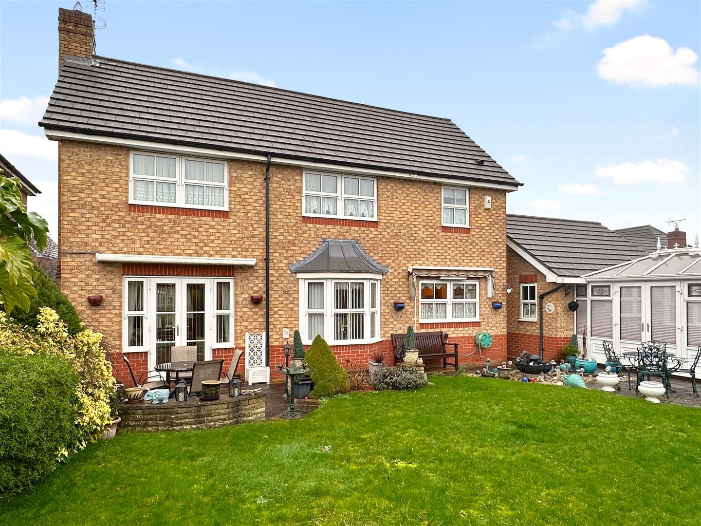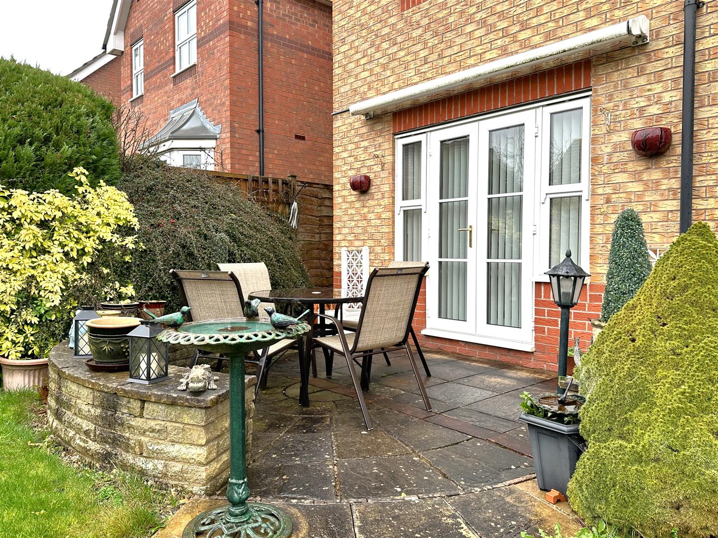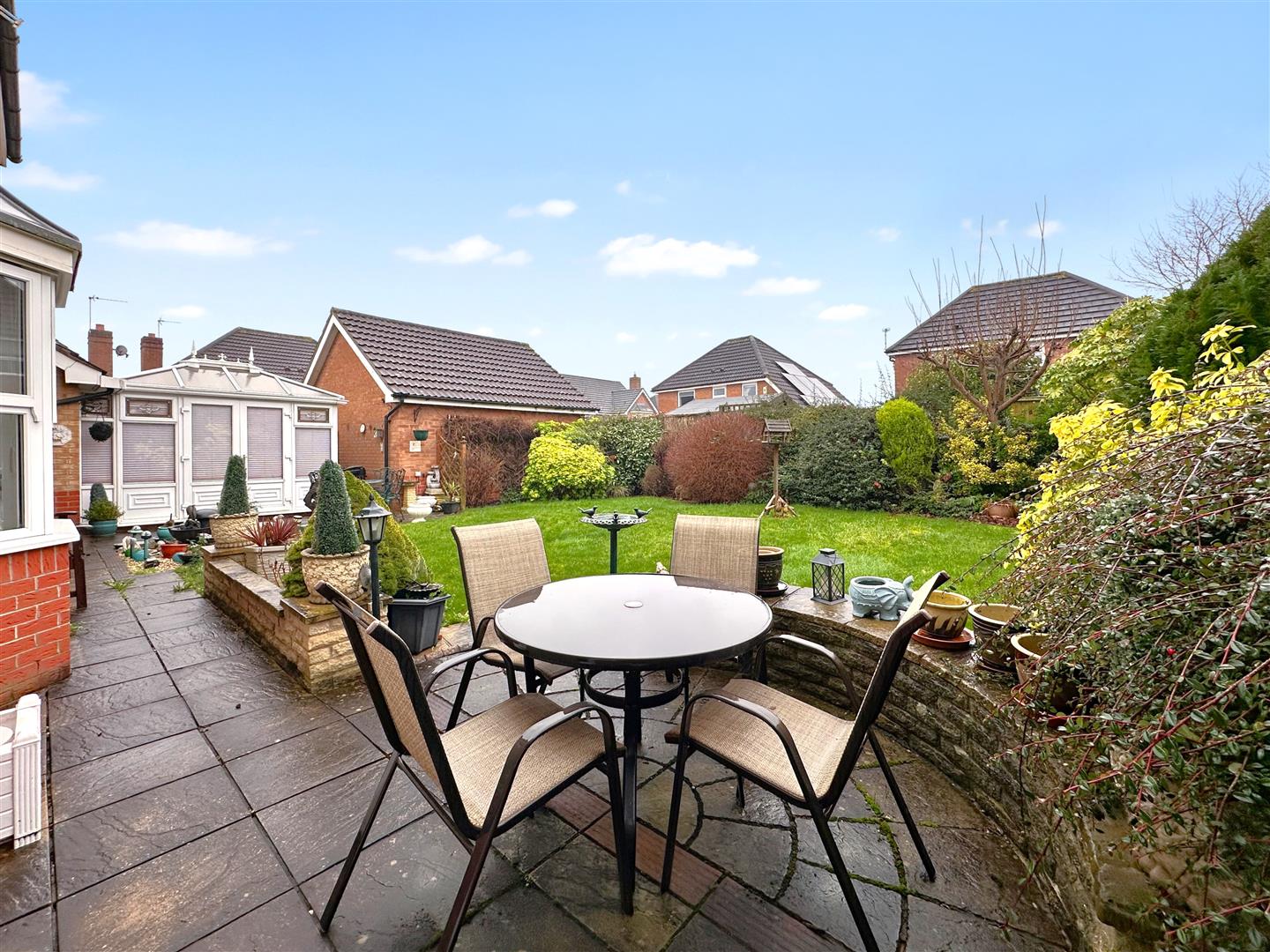 A secure wooden side gate leads down to the LOVELY and well-appointed rear garden. Predominantly laid to lawn, with attractive wrap-around planted borders. Filling the garden with colour and personality! There is a lovely oval paved patio, directly accessed from the uPVC double glazed French doors in the lounge. A paved pathway leads down to an additional paved seating area, with access into the conservatory. There are two awnings, an outside tap, double external power socket, fully fenced side and rear boundaries.