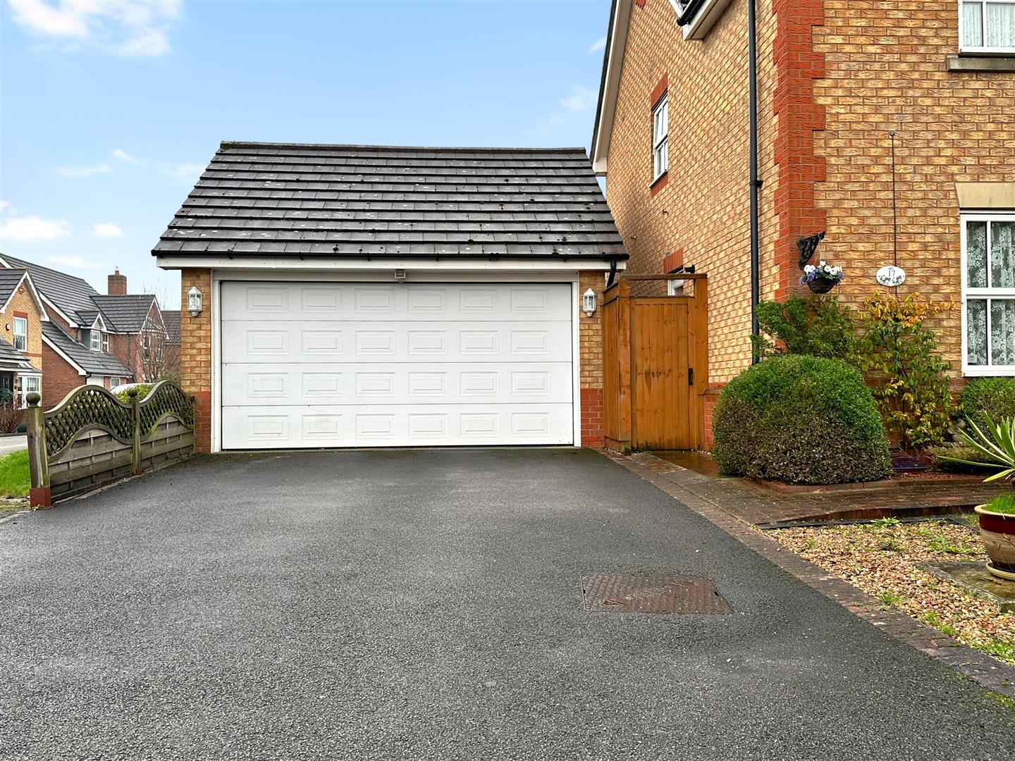 Of brick built construction, with a pitched tiled roof. Accessed via an electric roller garage door. Equipped with power, lighting and EXTENSIVE over-head eaves storage. uPVC double glazed window to the right side elevation. A right sided personal door gives access to the rear garden.