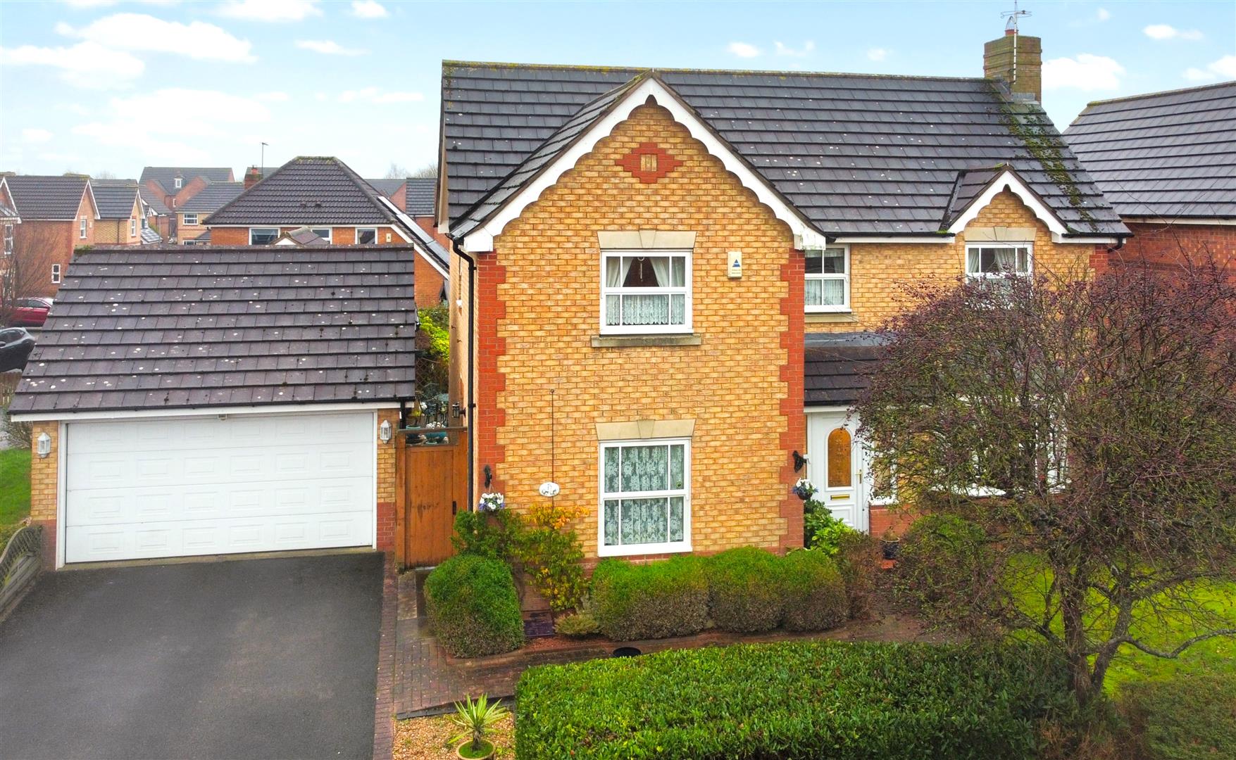 This property commands an excellent position, in a lovely, quiet and very popular cul-de-sac. Close to amenities and main road links. The front aspect provides a block paved pathway, leading to the front entrance door, with external wall light. The well-maintained front garden is of a great size. Predominantly laid to lawn, with a range of complementary mature bushes and trees. The left side aspect promotes a SUBSTANTIAL TARMAC DRIVEWAY. Ensuring off-street parking for a variety of vehicles. Leading into the DETACHED DOUBLE GARAGE, with two external wall lights and an electric roller door.