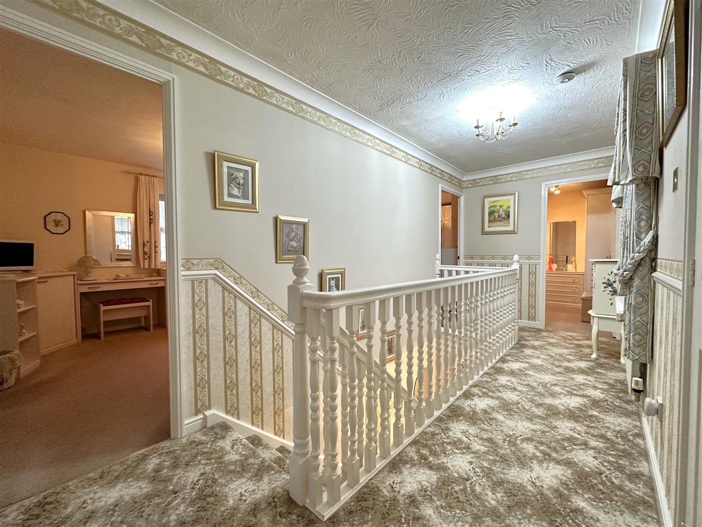 The galleried first floor landing leads to a three-piece family bathroom and FOUR WELL-PROPORTIONED BEDROOMS. All of which host EXTENSIVE FITTED WARDROBES. The master bedroom is further enhanced by a FOUR-PIECE EN-SUITE BATHROOM.