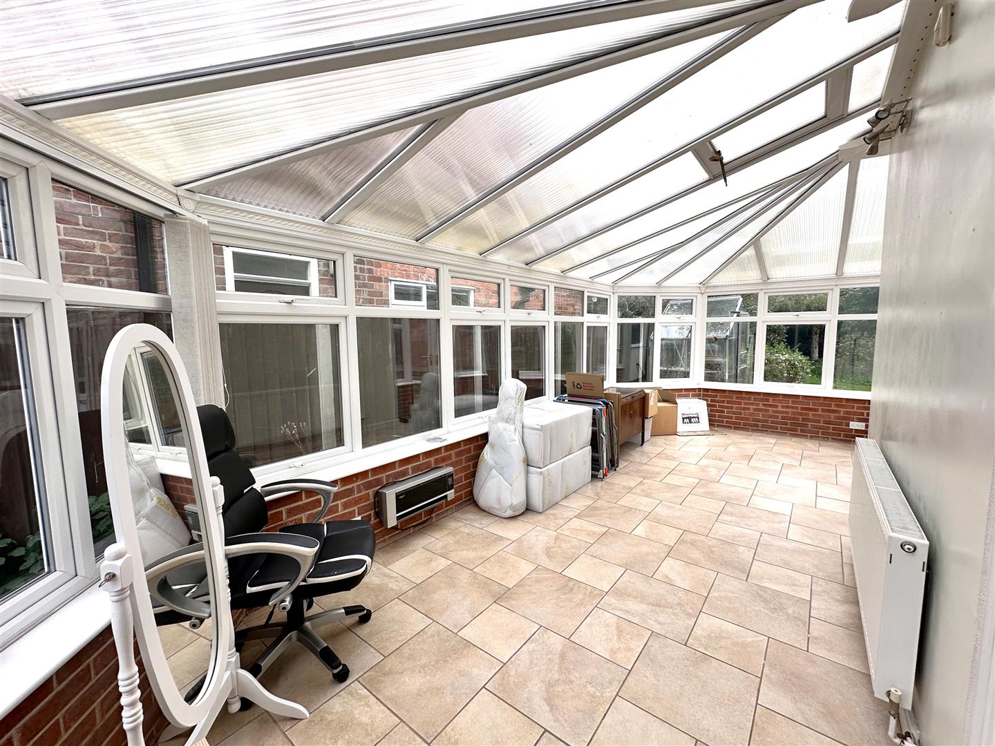 A HUGE multi-purpose space. Of part brick and uPVC construction, with a pitched poly-carbonate roof and roof light. Providing complementary ceramic tiled flooring, wall light fitting, large double panel radiator, telephone/TV connectivity points and a range of double electrical power sockets. Provision for a wall mounted electric heater. uPVC double glazed windows to the front and side elevations, uPVC double glazed French doors open out onto a large block paved seating area, within the delightfully private rear garden.