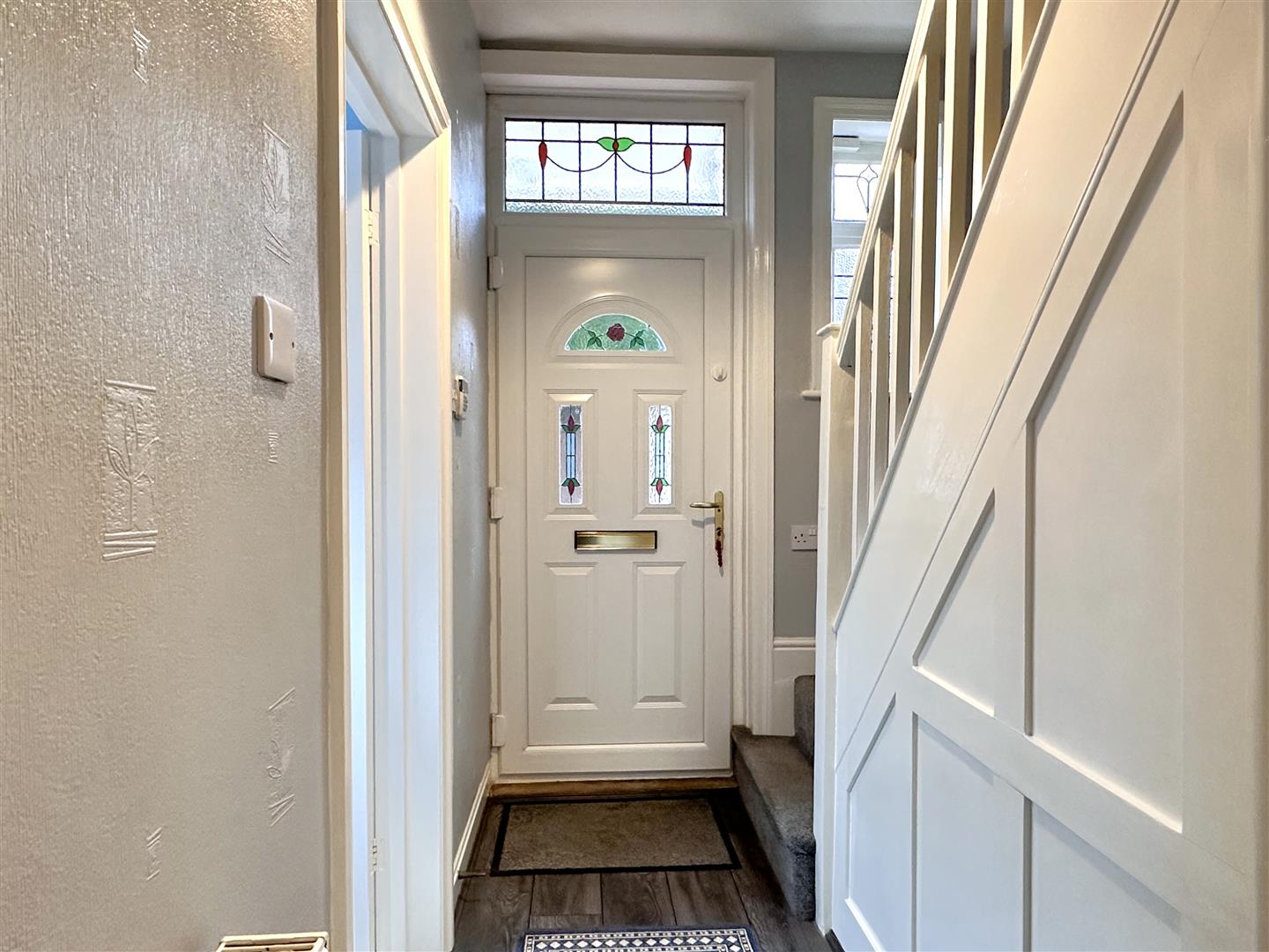 Accessed via an obscure uPVC side external door, providing complementary dark wood-effect laminate flooring, grey carpeted stairs with open-spindle balustrade and handrail rise to the first floor. Two ceiling light fittings, smoke alarm, all mounted alarm control panel, telephone connectivity point, double panel radiator and a useful under-stairs storage cupboard. complementary original hardwood single glazed stained glass window to the side elevation. Access into both reception rooms, the spacious kitchen and the ground floor W.C.