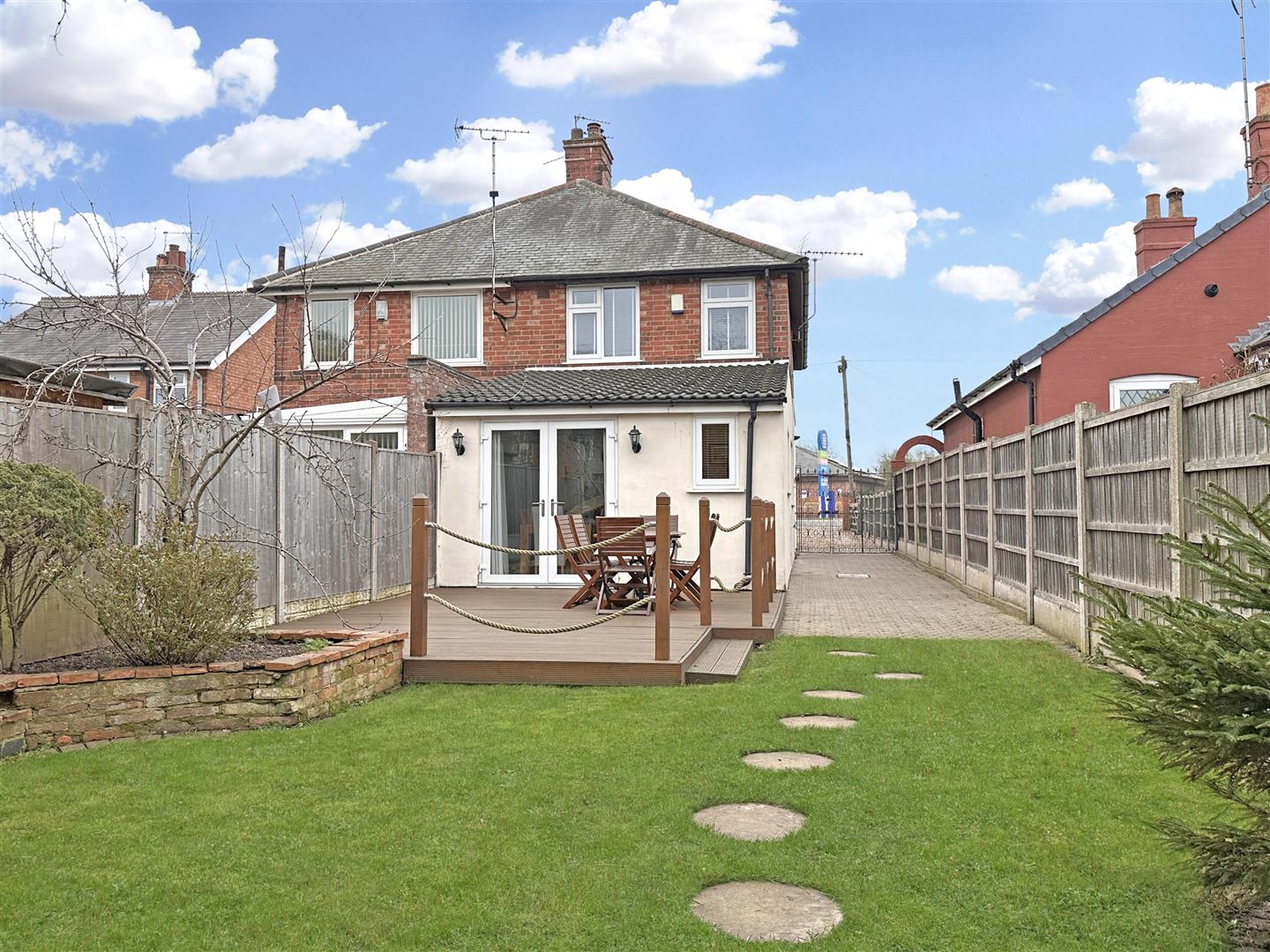 This centrally located home is conveniently set for ease of access onto the A1 and A46 corridor. Close to a range of on-hand amenities and set in walking distance to the Town Centre. This deceptively spacious home stands on a SUPERB 0.10 OF AN ACRE PRIVATE PLOT. The front aspect welcomes dropped kerb vehicular access onto a SUBSTANTIAL GRAVELLED & (wooden five-bar) GATED DRIVEWAY. Hosting off-street parking for a range of vehicles. The front garden is laid to lawn and promotes further off-street parking space, if required. There is a fenced left side boundary, privet hedged right side boundary and a walled front boundary. Wrought-iron double gates open via the left side aspect, onto a block paved pathway/ additional driveway, with outside tap, leading to the side entrance door. This also follows down to the LOVELY, LANDSCAPED and HIGHLY PRIVATE rear garden. Predominantly laid to lawn, with a vast array of complementary planted borders. Enjoying a variety of plants, bushes and shrubs. There is a large, raised decked seating terrace, directly accessed via the uPVC double glazed French doors in the dining room, with two external wall lights and partial rope-fenced boundaries.
