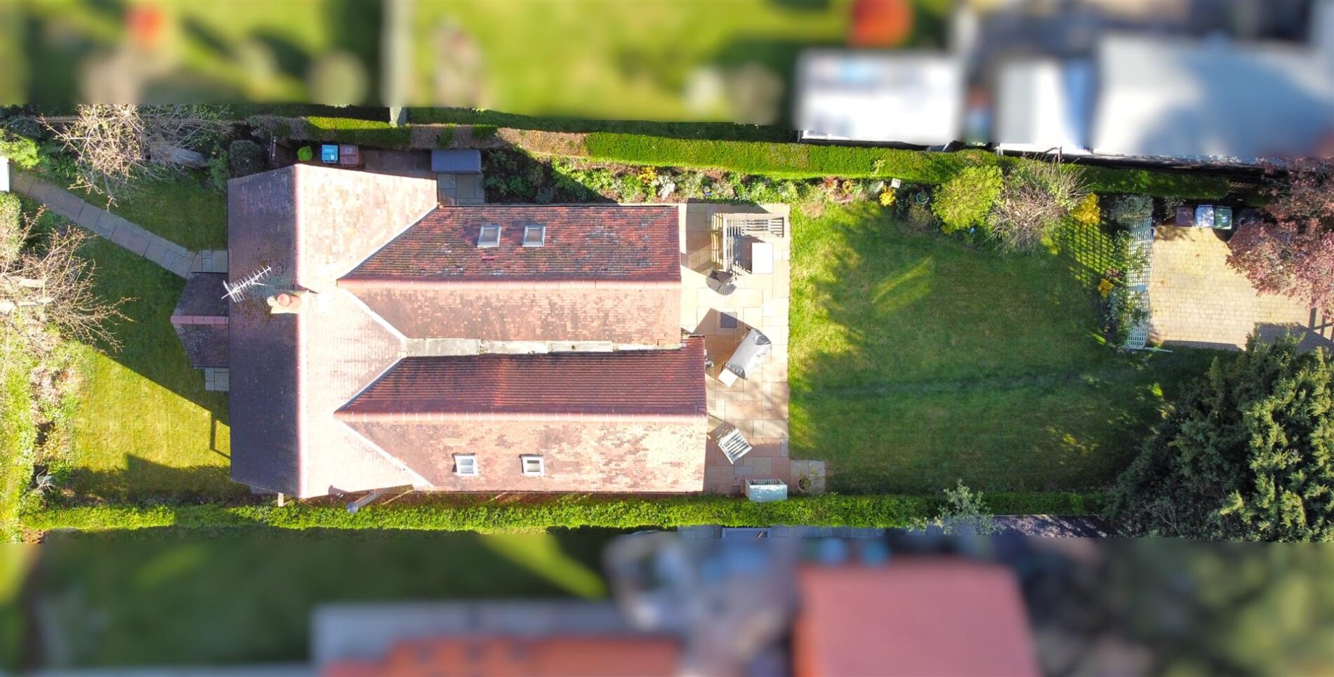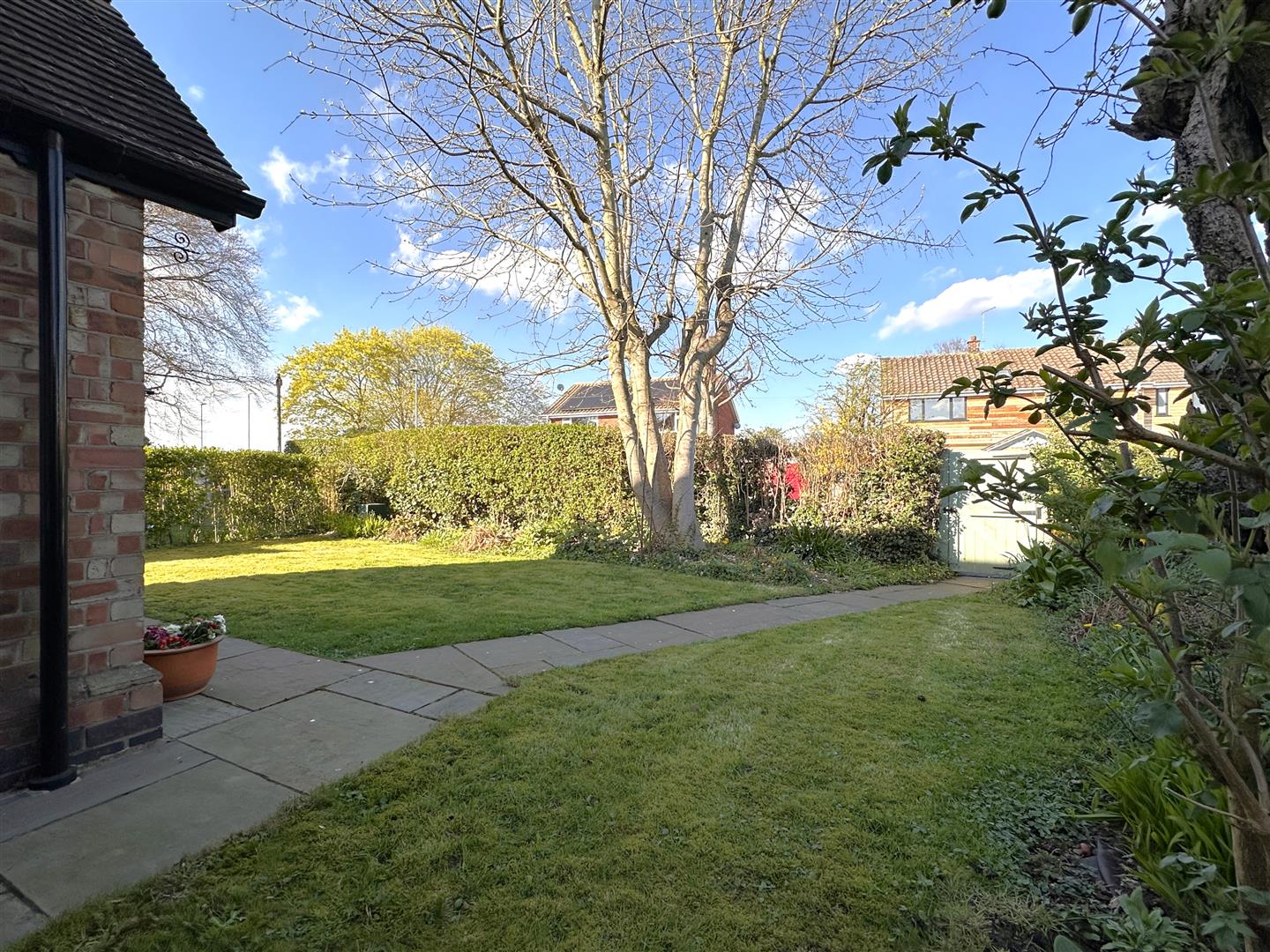 This charming and attractive non-estate detached home enjoys a delightful non-estate position. In a desirable village, close to amenities and main roads. The property stands proud on a magnificent 0.13 of an acre private plot. The front aspect is greeted with a wooden personal gated entrance, onto a paved pathway down to the front door. with external wall light above. The lovely front garden is lad to lawn. Enhanced by complementary planted borders. Hosting a variety of established plants, shrubs and a mature tree. There are hedged front and side boundaries. Both the left and right side aspect have a secure personal gate, onto a paved pathway EV charger to the left side) (outside tap to the right side) that lead down to the LOVELY & WELL-APPOINTED SOUTH FACING REAR GARDEN. Predominantly laid to lawn with complementary planted borders, a large Indian sandstone paved seating area and provision for a garden shed. There is a GATED BLOCK PAVED DRIVEWAY located at the bottom of the garden. Also accessed via Pinfold Lane. Ensuring AMPLE PARKING for a variety of vehicles. There is an external security light, hedged side and rear boundaries.