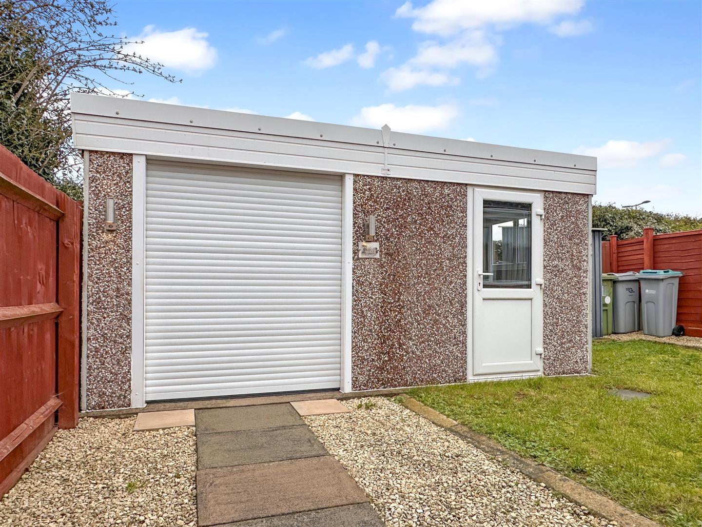 Of concrete sectional construction. Accessed via an ELECTRIC ROLLER GARAGE DOOR, with two external up/ down lights. Equipped with internal power and lighting, via two ceiling strip-lights. Carpeted flooring and a fitted laminate roll-top work surface. Hosting great multi-use potential. uPVC double glazed window to the right side elevation. A uPVC double glazed personal door to the front elevation, leads out to the garden.