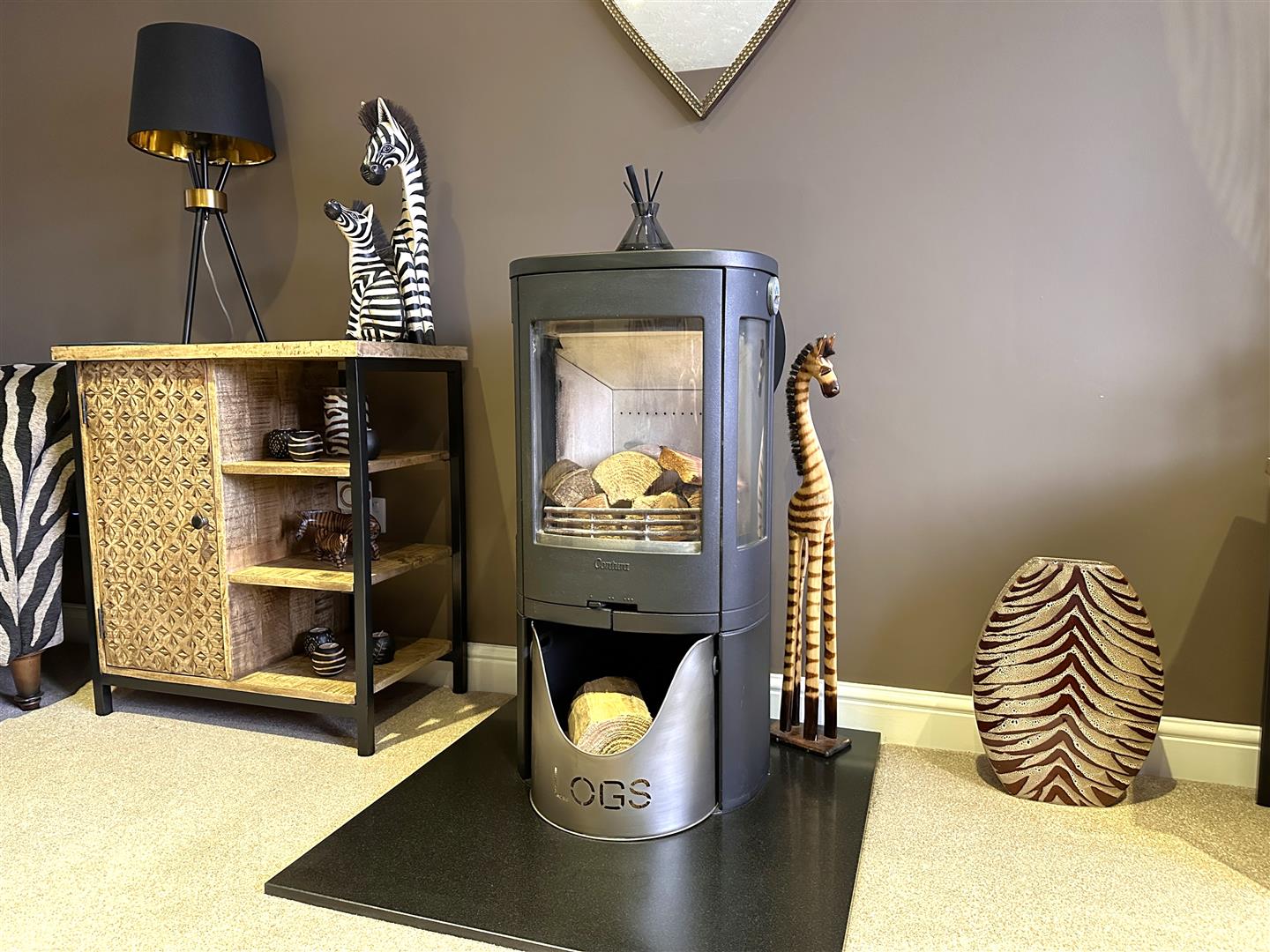 A spacious reception room with Swedish (Contura) log burner, bespoke fitted shutters and air-conditioning.