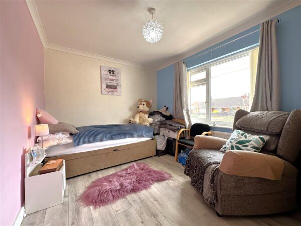 A further DOUBLE bedroom, located at the rear of the bungalow. Providing grey carpeted flooring, a ceiling light fitting, coving, PIR alarm sensor, single panel radiator, extensive fitted wardrobes and fitted corner shelving. uPVC double glazed window to the rear elevation, overlooking the beautifully landscaped private garden.