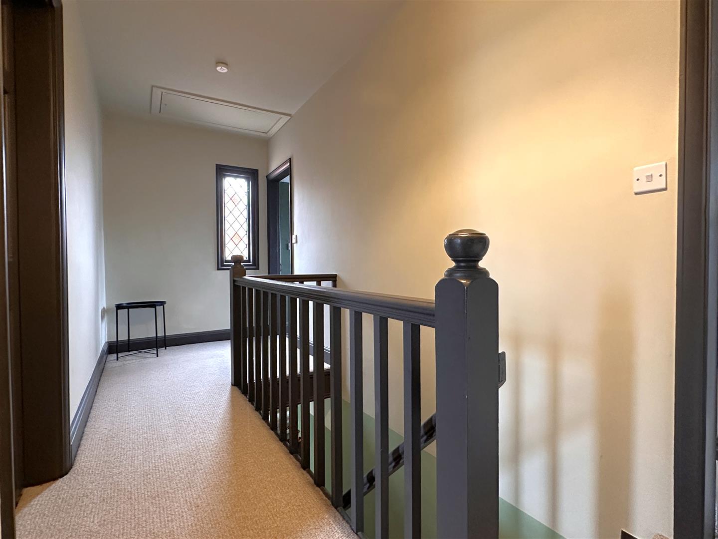 The large galleried-style landing provides a useful study space, with an original retained stained glass window. Leading into THREE BEDROOMS and a LAVISH FAMILY BATHROOM.