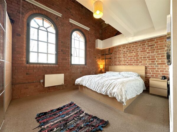 A wonderful DOUBLE bedroom, located at the rear of the apartment (South facing). Providing exposed original brick walls, a ceiling light fitting with mezzanine above. Wall mounted electric heater, TV/telephone connectivity points. Two original arched and paned windows to the rear elevation with secondary glazing installed. Max measurements provided.