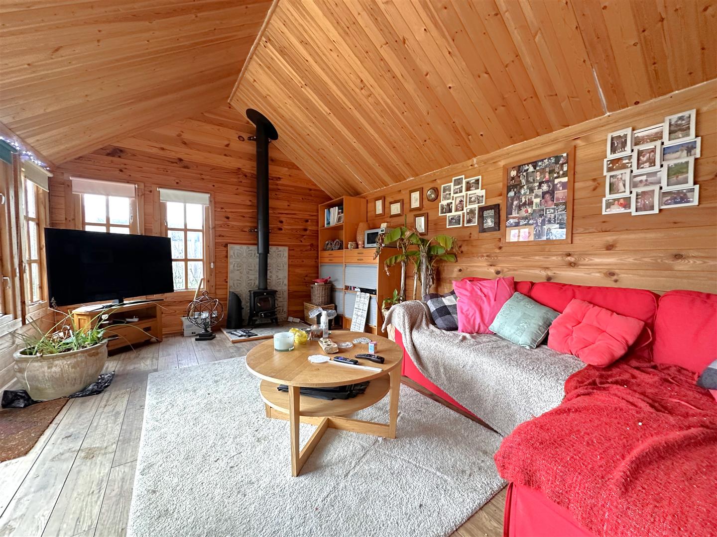 Of timber construction, with a pitched and insulated felt roof. Accessed via paned French doors. There are four paned windows to the front elevation, two to the left side elevation and two to the right side elevation. Hosting complementary oak laminate flooring, a log burner with a raised and patterned tiled hearth. Equipped with power, lighting and great scope to be utilised for a variety of purposes. Currently being used as a functional home office with a relaxing seating area.