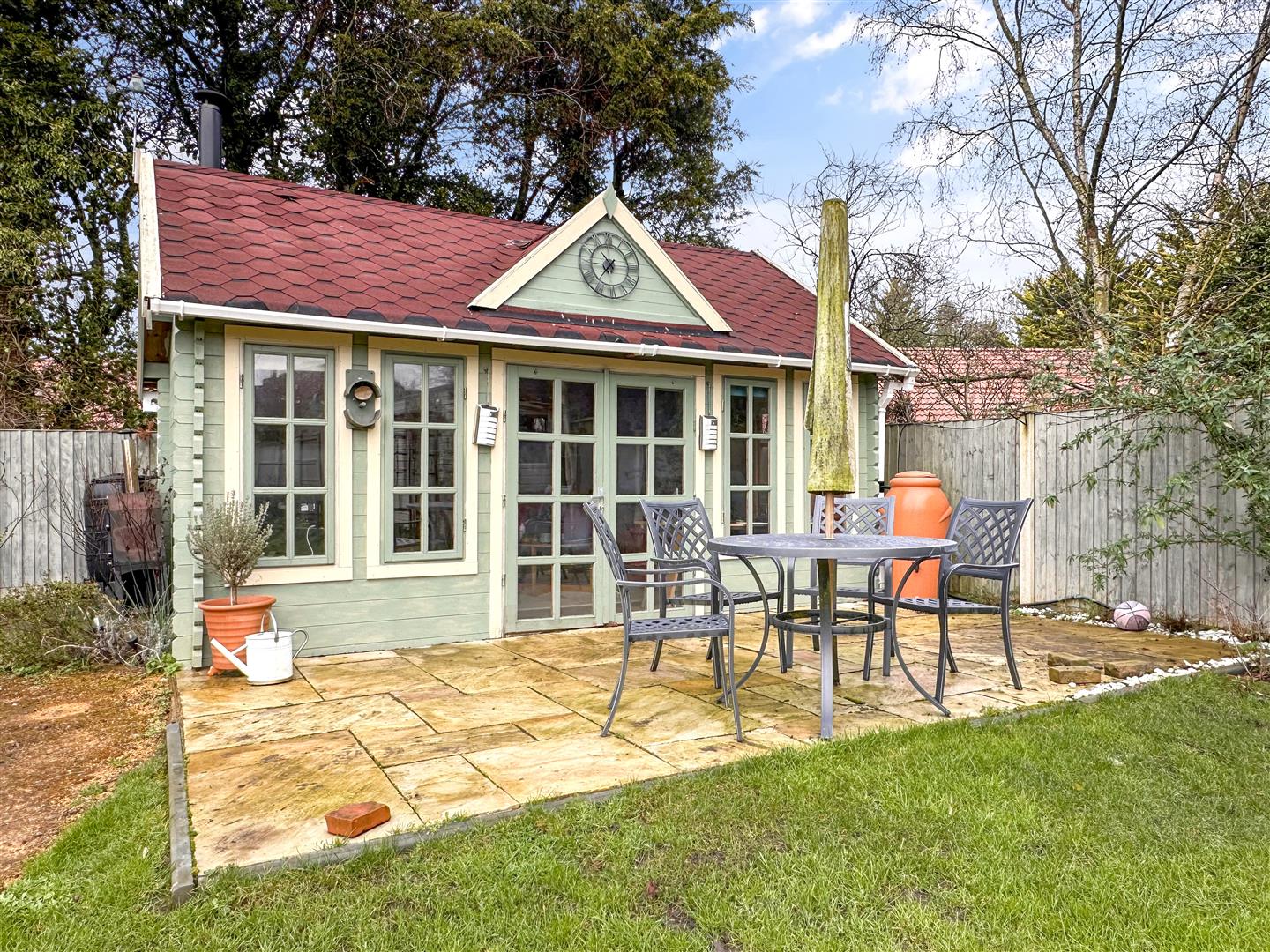 The bright and beautiful rear garden presents a WONDERFUL EXTERNAL ESCAPE. Leading down to a DETACHED MULTI-PURPOSE CABIN. Fully insulated and equipped with power, lighting and a log burner. Creating an ideal home office environment.
