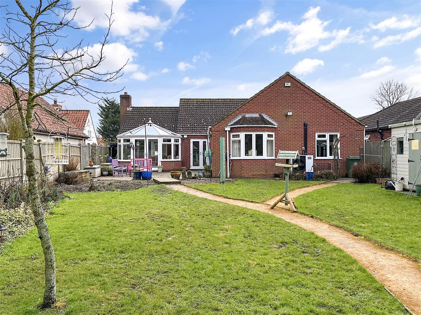 This beautiful individual residence is pleasantly positioned in the heart of a pretty semi-rural village. Holding close links to Claypole and ease of access onto the A1 with access to Newark and Grantham. The bungalow STANDS PROUD on a wonderful 0.22 of an acre private plot. The front aspect is greeted with a substantial BLOCK PAVED DRIVEWAY. Ensuring AMPLEOFF-STREET PARKING AND ACCESS INTO THE integral double garage, with EV charger and three external up/ down lights. There are complementary planted borders. Hosting a range of mature plants, bushes and shrubs. A low-level walled front boundary and fenced side boundaries. The left side aspect has a secure wooden personal gate, with paved pathway and three external up/ down lights, leading down to the WELL-APPOINTED and HIGHLY PRIVATE rear garden. Promoting a tranquil external escape. Predominantly laid to lawn, enjoying attractive planted borders and a sweeping pathway down to the bottom of the garden and a lovely paved seating area. Located directly in front of the LARGE LOG CABIN. There is an additional and equally sizeable paved seating area, directly accessed from uPVC double glazed French doors in the sitting room and conservatory. Provision for a large garden shed, summer house and greenhouse. There are two external security lights, an outside tap, fenced side and rear boundaries. Enhanced by an unspoiled tree-lined outlook to the rear.