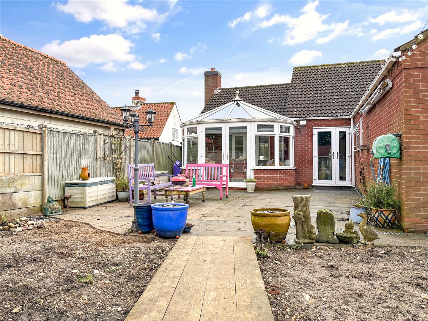 Of part brick and uPVC construction, with a pitched glass-roof. Providing complementary tiled flooring, a double panel radiator, power, lighting, uPVC double glazed windows to both side and rear elevations. uPVC double glazed French doors leads out onto a substantial and private seating area.