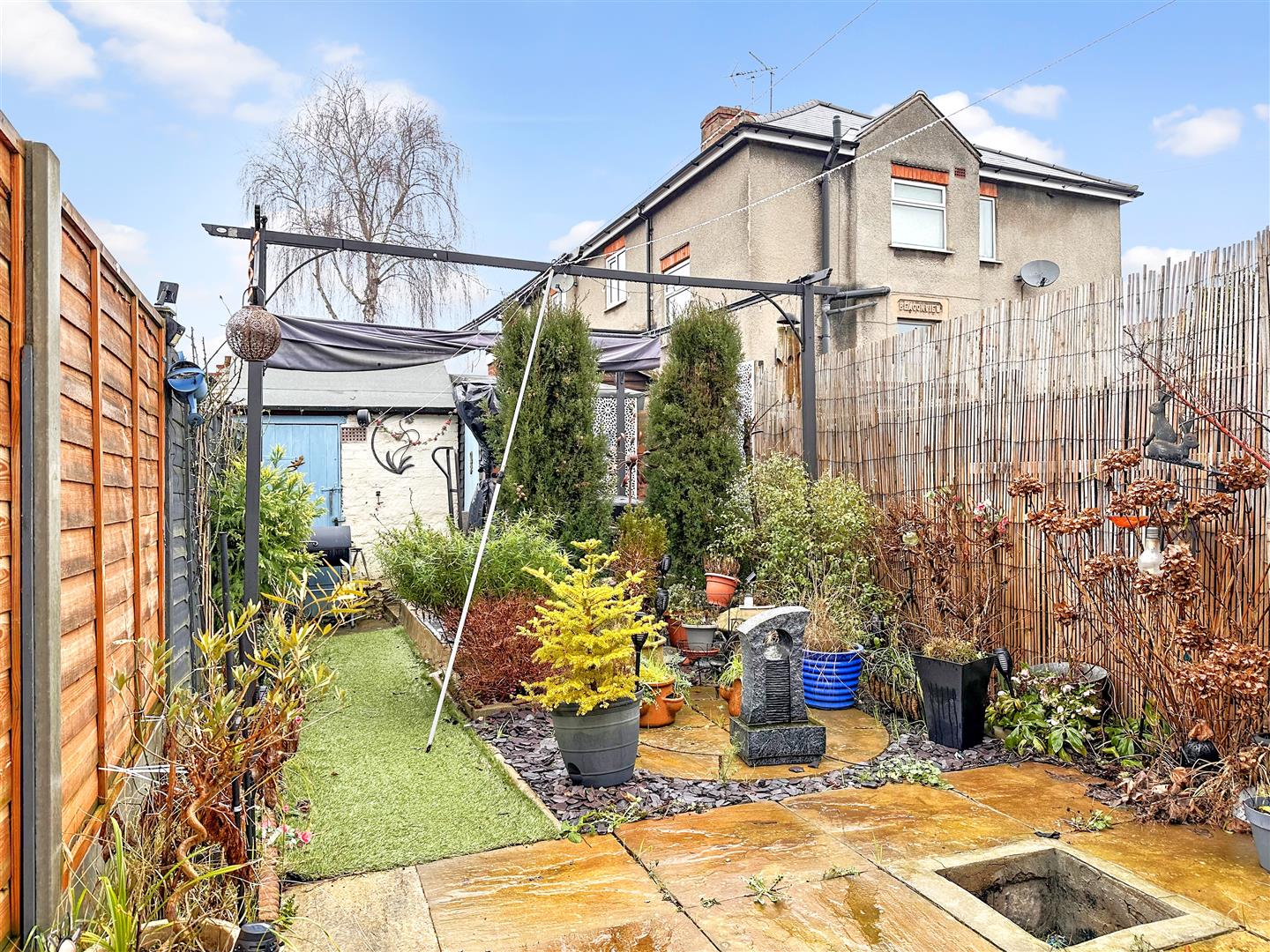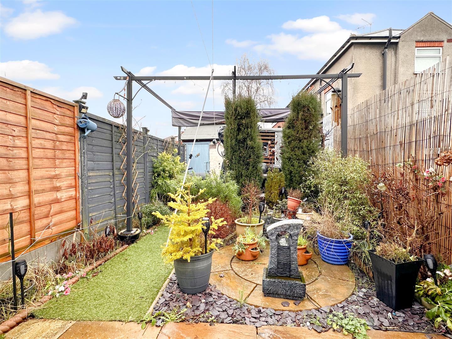 The lovely, low-maintenance and fully enclosed rear garden is provides a partial artificial lawn and predominantly hard landscaped, with slate shingled borders and a variety of mature shrubs and bushes. There is a paved seating area, with inset firepit. Access to a brick built outbuilding and an attached shed. There is an outside tap, external lighting, fully fenced side and rear boundaries. A left side wooden personal gate gives access over a neighbouring home, onto a shared passageway, which leads to the front of the house. PLEASE NOTE: There is NO SHARED ACCESS across this properties garden.