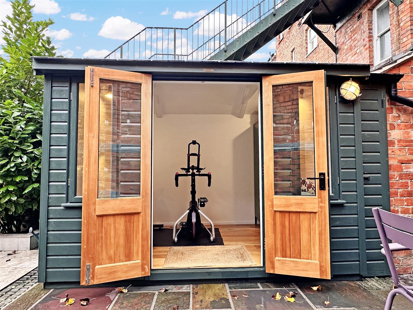 Of timber construction, with a pitched slate-effect rubber roof. Providing oak laminate flooring. Equipped with power, lighting and multi-purpose potential Currently setup as a functional home gym.