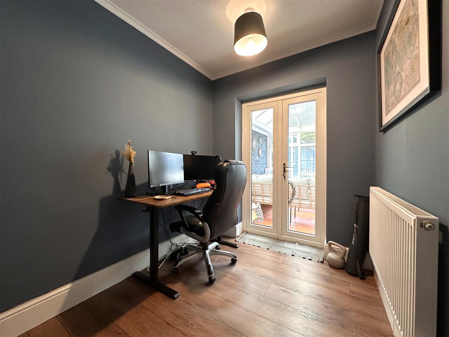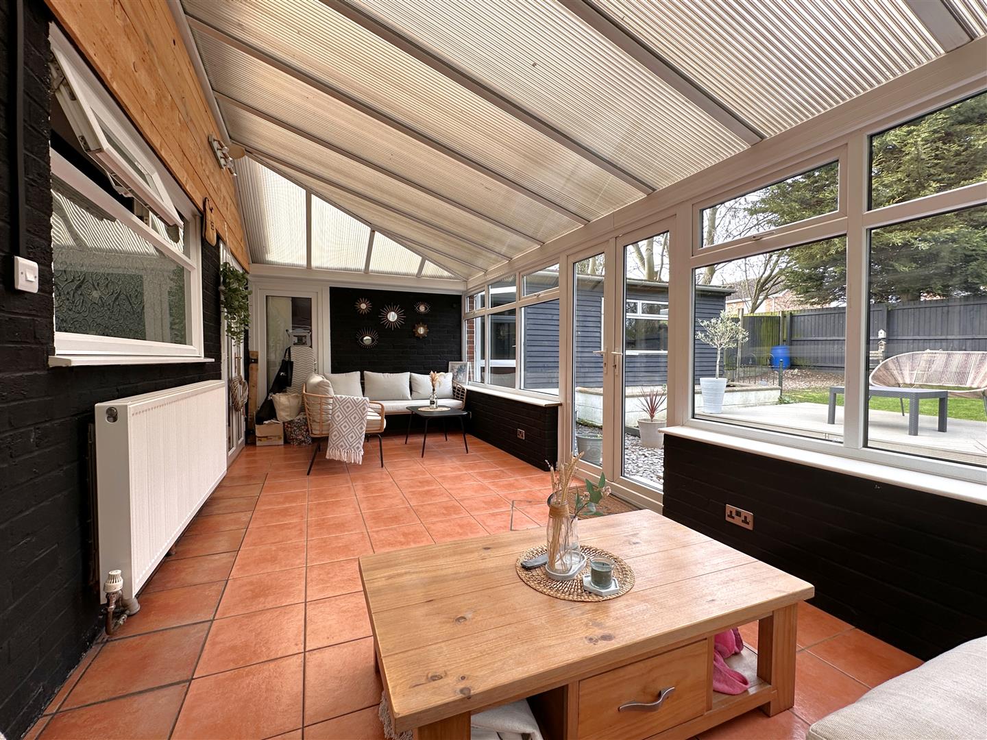 Of part brick and uPVC construction, with a sloped poly-carbonate roof. Providing ceramic tiled flooring, a large double panel radiator, power and lighting, via two wall light fittings. uPVC double glazed windows to the right side and rear elevations. uPVC double glazed French doors and a right sided uPVC double glazed personal door open out to the lovely, private and well-appointed rear garden.
