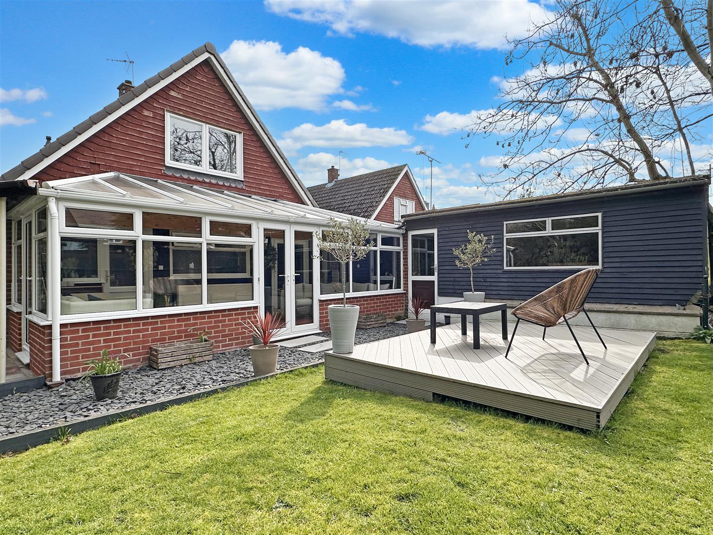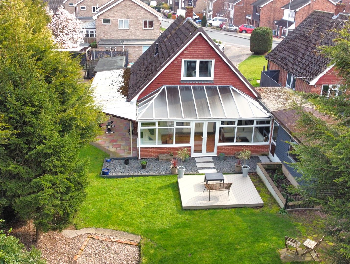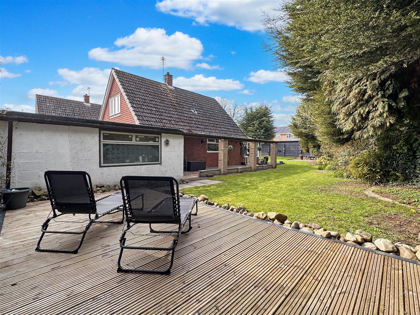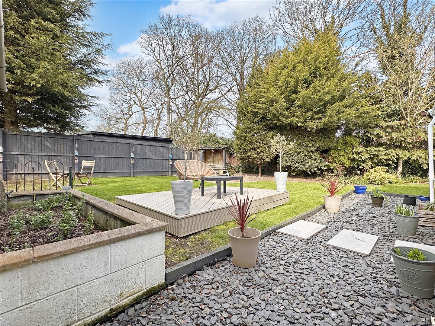This attractive home stands on a MAGNIFICENT 0.17 OF AN ACRE PRIVATE PLOT. The front aspect is greeted with dropped kerb vehicular access onto A SUBSTANTIAL CONCRETE DRIVEWAY. Emphasising parking for a range of vehicles, including a caravan/ motorhome. There are two external wall lights and a raised wildlife garden, which could be adapted to create further parking spaces, if required. Secure right sided wooden double gates open through to a spacious timber-framed carport with poly-carbonate roof. Currently utilised for useful external storage. The front driveway continues down to a further paved driveway space, leading to the INTEGRAL SINGLE GARAGE and side entrance door, with external wall light and concealed gas meter. Part fenced/ open left side boundaries, fenced right side boundary and open front boundaries. A secure right sided external door opens through to a large 35ft SIDE ENTERTAINMENT PORCH. Extensively paved with brick pillars and a sloped poly-carbonate roof. Supplying two wall light fittings, a double external power socket and an outside tap. Showcasing a great, covered and secluded space to relax and unwind. Access into a useful attached outbuilding/ workshop. The WELL-APPOINTED PRIVATE GARDEN is simply a joy to behold. Predominantly laid to lawn, full of colour, tranquility and well-maintained planted borders. Hosting a range of established plants, bushes and shrubs. There are two raised decked seating terraces, partial raised plant beds, a slate shingled and gravelled spaces for seating/ potted plants. Access into the ATTACHED HOME BAR. The garden is immensely private, with part fenced, hedged and tree-lined borders. Enhancing the idyllic setting and retained privacy, all year round.